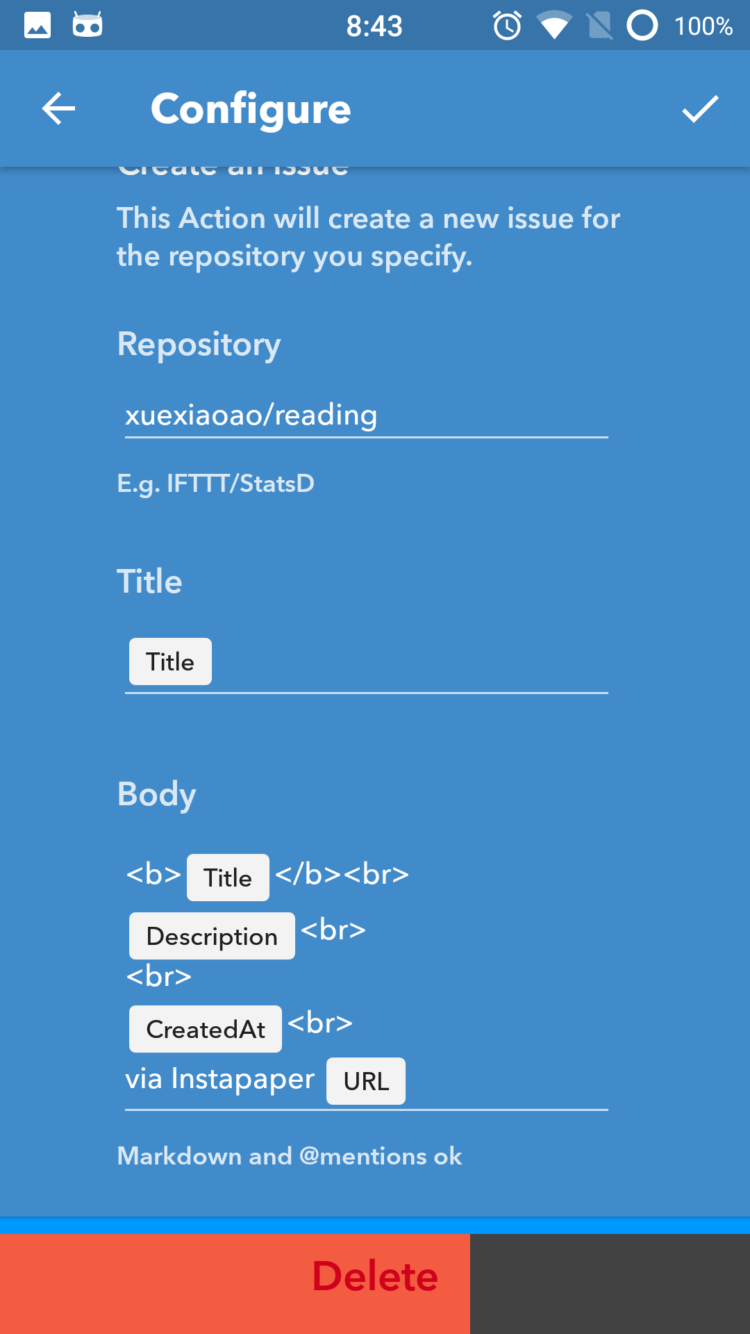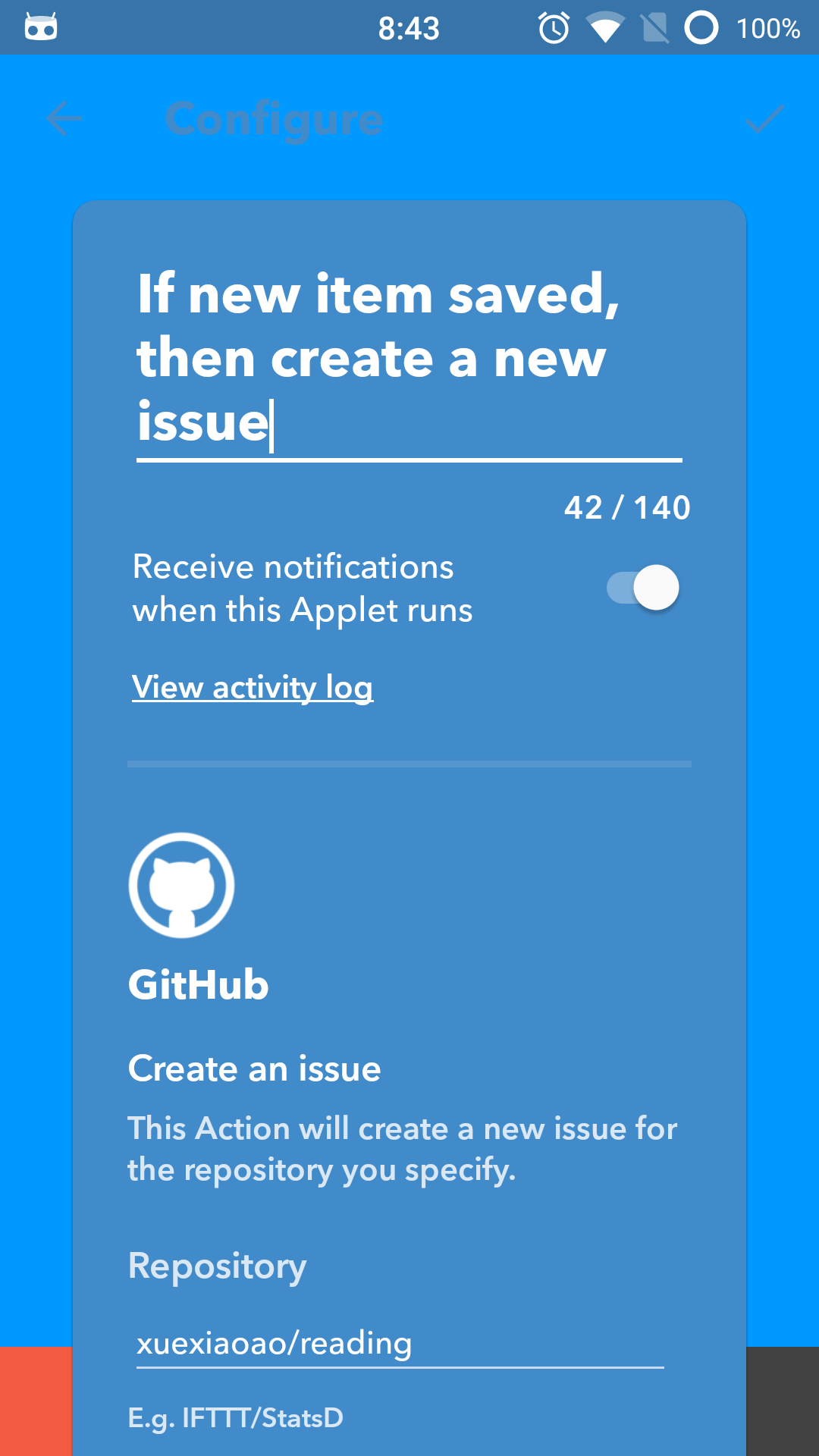 得益于 IFTTT 非常丰富的第三方服务,IFTTT 可以直接创建 Instapaper 与 GitHub Issue 相集成的 Applet:If new item saved, then create a new issue - IFTTT,就可以在当 Instapaper 新增文章的时候,自动在 GitHub 所指定的仓库 xuexiaoao/reading 中创建一个新的 Issue 并添加相应的标题、链接以及描述等相关信息